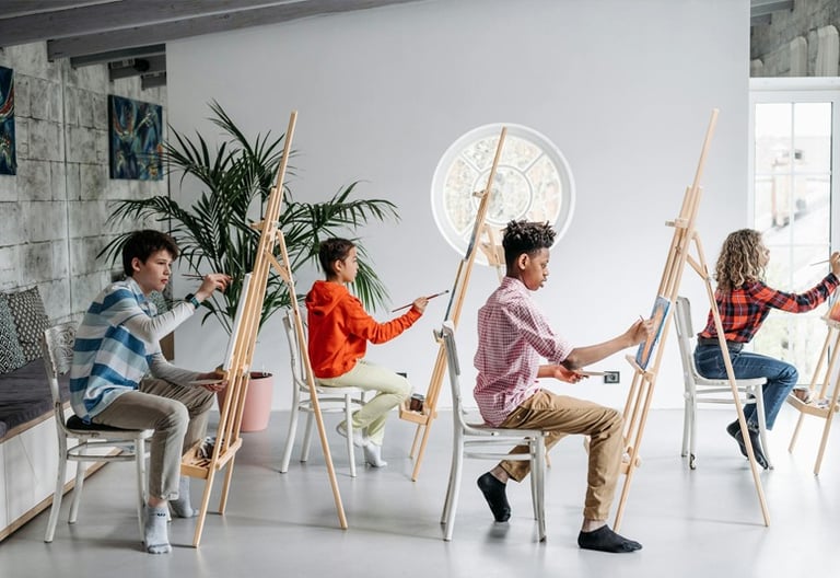 Visual Arts Studio: Students explore various forms of art, from painting and sculpture to digital design, participating in art exhibits and competitions.